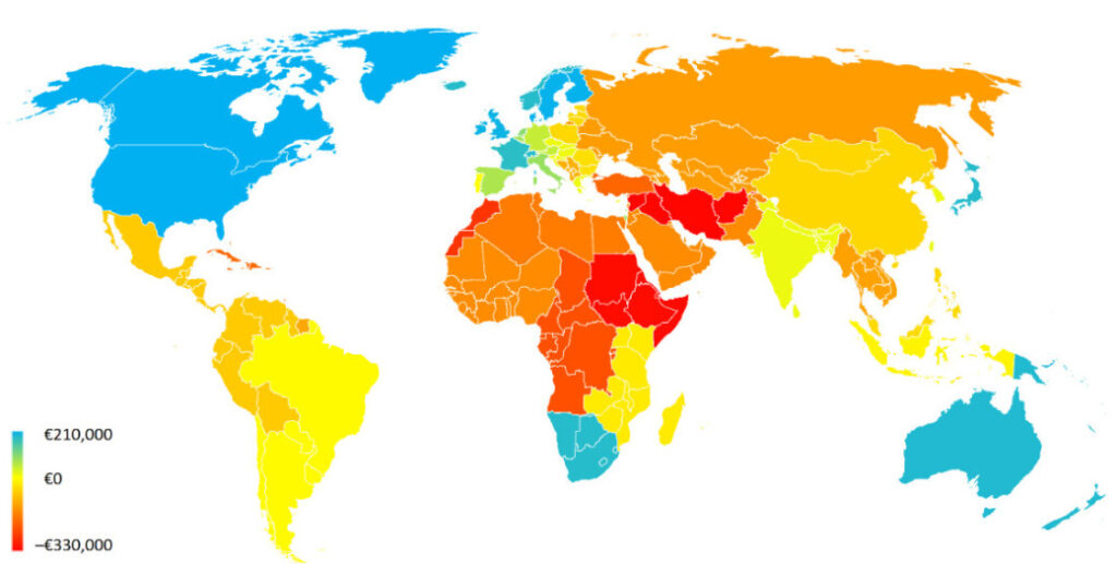 Die IZA-Studie hat sich am Beispiel der Niederlande – einem europäischen Land mit sehr hoher Migration – angesehen, welche Migranten der ersten Generation (!) wieviel zum Sozialstaat beitragen. Sie haben – und schon das ist ein Durchbruch gegen die „woke“ Ideologie – diese Erkenntnis nüchtern nach Nationalität quantifiziert und für alle Länder der Welt ausgerechnet und es dann „gewagt“, eine Grafik zu erstellen, die wir nun präsentieren wollen. Diese schlüsselt die Kosten der Migration für den Staat auf. Einwanderer aus westlichen Industriestaaten (z. B. Skandinavien, Nordamerika, Japan) leisteten über ihre Lebenszeit klare positive Netto-Beiträge für die niederländische Gesellschaft. Immigrantengruppen aus vielen nicht-westlichen Regionen (z. B. Teile Afrikas, Naher Osten, Karibik-Region) weisen im Schnitt durchwegs negative fiskalische Beiträge in den niederländischen Daten auf. Diese regionalen Muster spiegeln natürlich kulturelle Unterschiede wie auch Unterschiede beim Bildungsstand, der Arbeitsmarktteilhabe, Alter beim Zuzug, Familien- und Asylmigration wider.