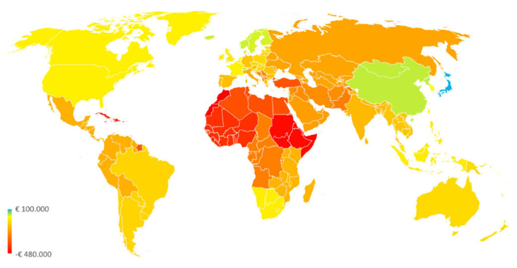 In der obigen Grafik sieht man schön, dass Migration aus den meisten Ländern der Welt in der zweiten Generation für den niederländischen Staat kein positives Geschäft mehr ist. Das liegt natürlich an einem gut ausgebauten Sozialstaat, der dem niederländischen Steuerzahler dann pro Migrantenkind der zweiten Generation eine hohe Rechnung ausstellt. Aber auch hier sind die Unterschiede natürlich enorm. Während die Niederlande ein Kind europäischer Migranten rund 100.000 Euro kostet, sind es bei Kindern afrikanischer oder arabischer Migranten teilweise bis zu 480.000 Euro. Von diesem staatlichen „Investment“ der Niederlande profitiert dann natürlich die niederländische Privatwirtschaft in Form von mehr verfügbarer Arbeitskraft / Talent und mehr potentiellen Unternehmensgewinnen. Deshalb machen die rund 100.000 Euro pro europäischem Migrant der zweiten Generation wirtschaftlich wohl einen gewissen Sinn. Wenn man aber nun wie in vielen afro-arabischen Ländern gleich eine halbe Million Euro als Staat für diese Menschen ausgeben muss, dann werden diese enormen Kosten auch die zusätzlich verfügbare Arbeitskraft dieser Menschen nicht wettmachen können.