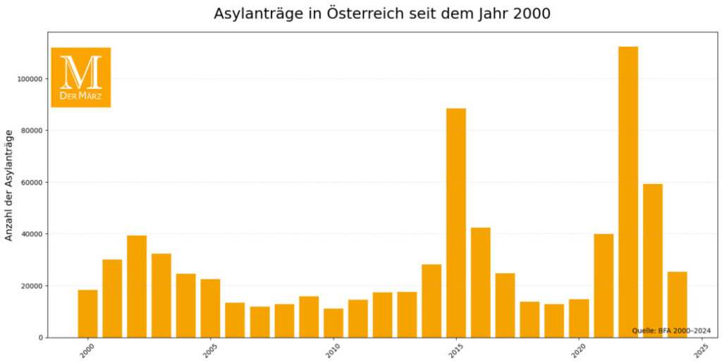 Noch deutlicher wird die Dimension, wenn man die demographische Entwicklung der letzten Jahre betrachtet: Laut Statistik Austria ist fast das gesamte Bevölkerungswachstum der letzten Dekade ausschließlich durch Zuwanderung zustande gekommen. Zwischen 2014 und 2024 wuchs die Bevölkerung um rund 651 000 Menschen – die Nettozuwanderung lag im selben Zeitraum bei rund 667 000 Personen! Ohne Migration wäre Österreich also demografisch ganz leicht geschrumpft – mit Migration wächst es dagegen rasant und zwar deutlich schneller, als das Land diese Migration assimilieren kann. Ein großer Teil dieser Migranten kam dazu auch noch illegal über die „Asyl-Schiene“ ins Land und wanderte somit direkt ins Sozialsystem ein, ohne auch nur einen Euro eingezahlt zu haben.