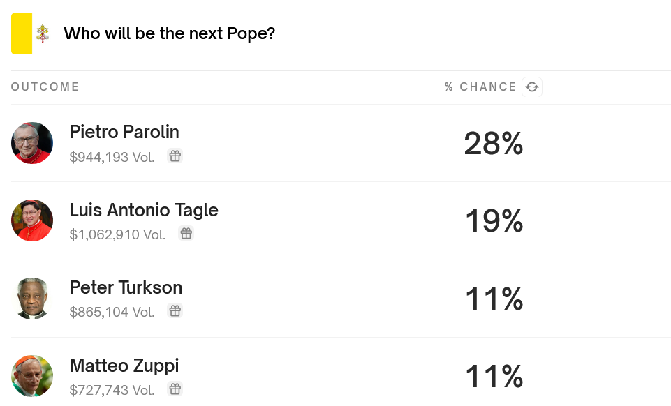 Papabili, wörtlich: papstfähig, umschreibt beim Konklave jene Kardinäle, denen zugetraut wird das Papstamt in Rom zu übernehmen; Polymarket „setzt“ derzeit auf diese Kandidaten