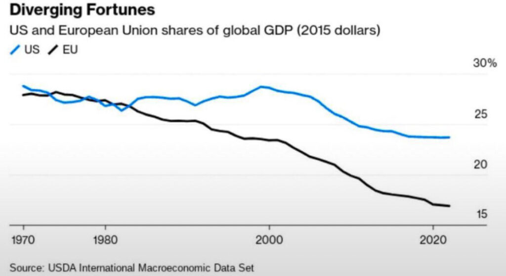 Mit der neuen nationalen Sicherheitsstrategie der USA demonstriert die Trump-Administration, dass sie anders als viele europäische Politiker, viele leitende Beamte in der EU, bzw. in den relevanten Mitgliedsländern dieser die Welt realistischer einschätzt, als es Europa gefällt. Die EU hat im Jahr 2000 die sogenannte „Lissabon-Strategie“ verabschiedet, in der das Ziel ausgegeben wurde, bis 2010 zur wettbewerbsfähigsten und nachhaltigsten wissensbasierten Wirtschaft weltweit zu werden. Tatsächlich aber ist der Anteil der EU am globalen BIP – wie uns die US-Sicherheitsstrategie korrekt darlegt – von 25 Prozent (1990) auf 14 Prozent (2025) eingebrochen. Das heißt, die EU ist – anders als die USA – im globalen Vergleich relativ ärmer geworden, wozu die Politik gegenüber China – Stichwort Deindustrialisierung – wie auch die desaströse Geburtenentwicklung ihren Anteil geleistet haben. Dazu kommt die mangelnde Innovationsfähigkeit im Tech- und Digitalbereich, wo die EU nun China und den USA hinterhinkt und nur mehr von Regulieren träumt.